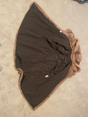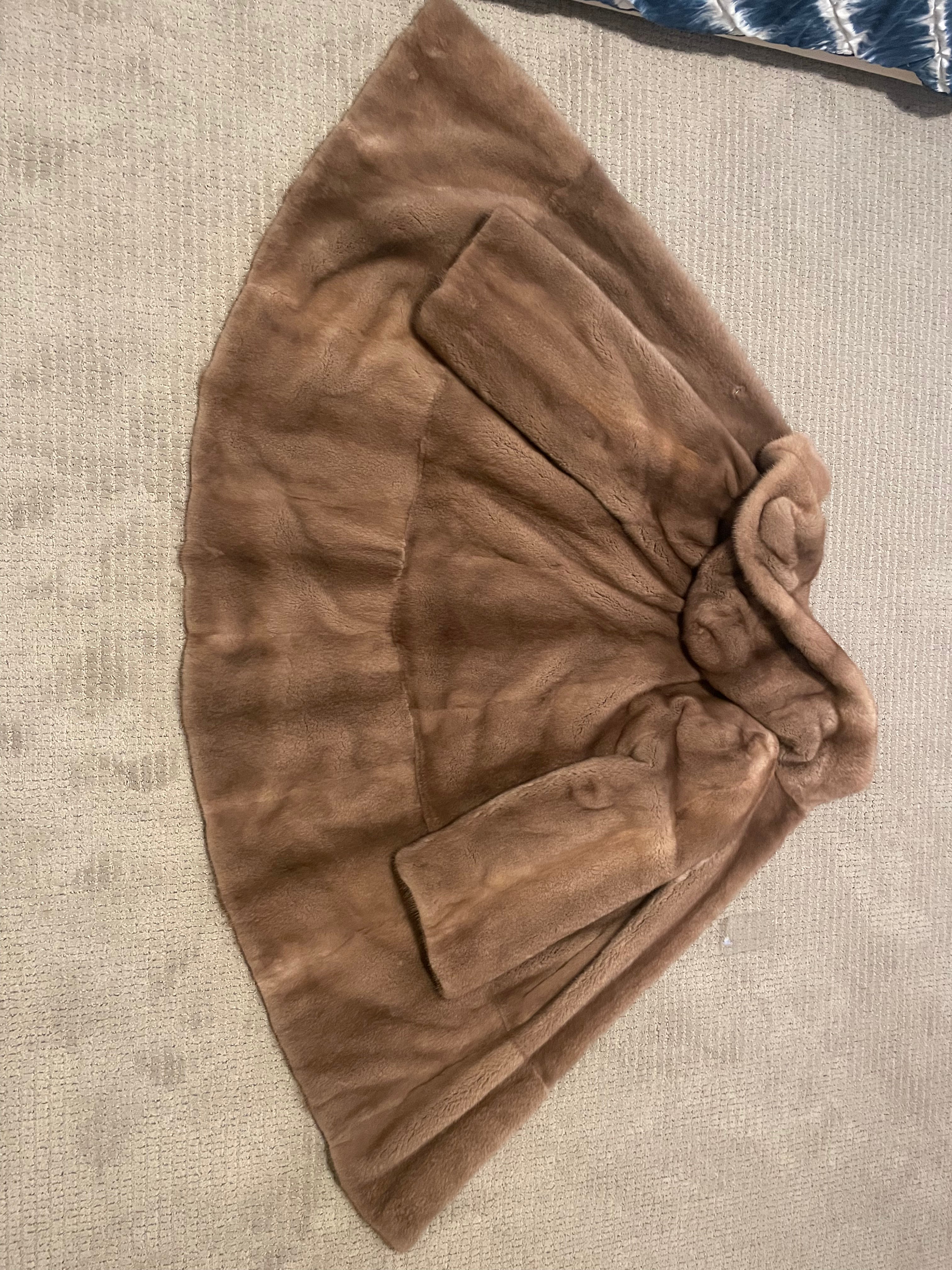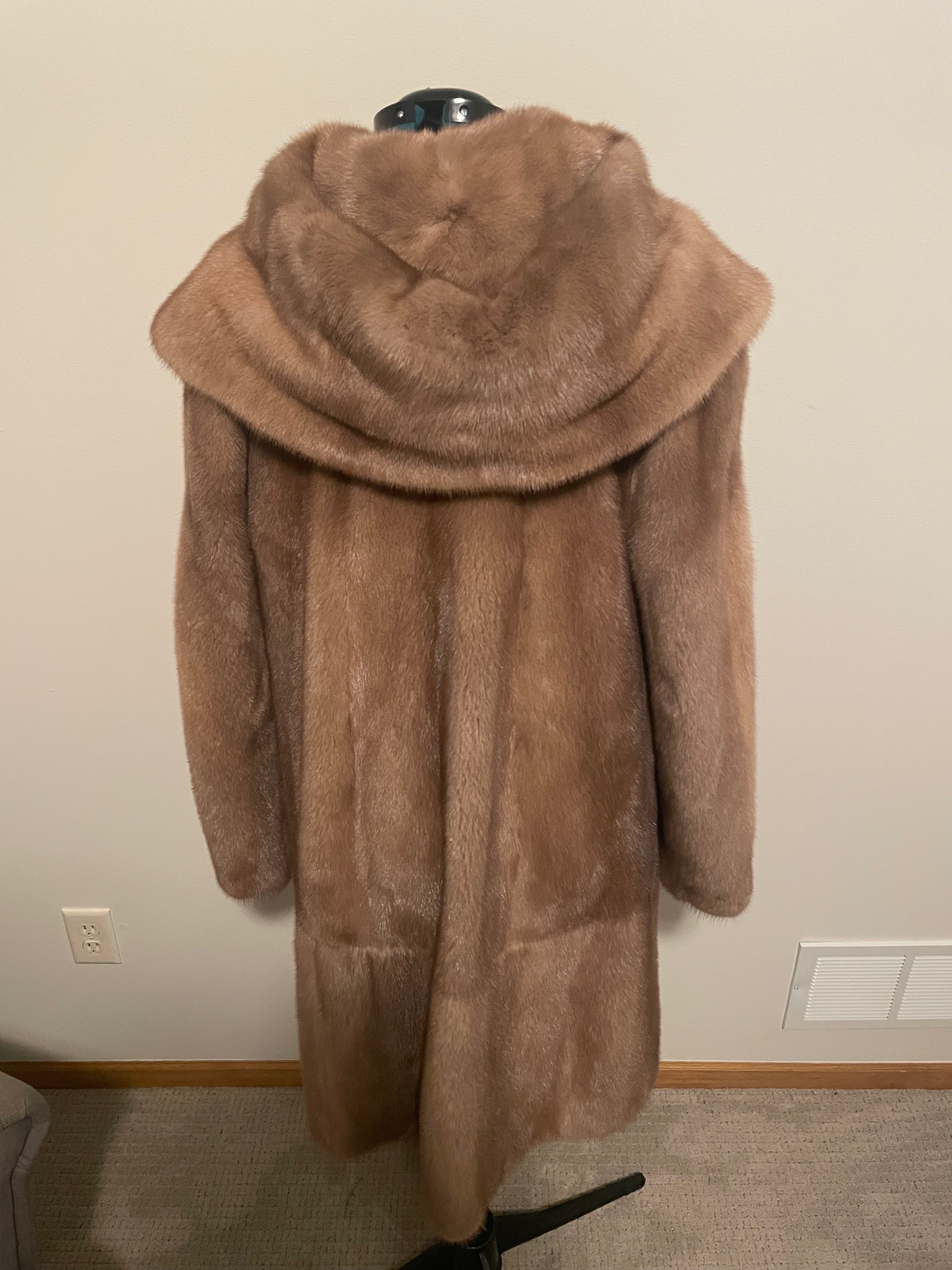 This is a like new, authentic mink fur coat, expertly crafted in Greece and finished in a rich, warm brown tone. A standout feature of this piece is its luxurious double-sided mink hood, offering both warmth and elegant versatility while maintaining a refined silhouette.
