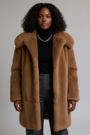 The coat is constructed from dense, glossy mink pelts with an even pile throughout, showcasing superior craftsmanship and quality. The design features a flattering mid-length cut and a full, flowing sweep that moves beautifully when worn.
