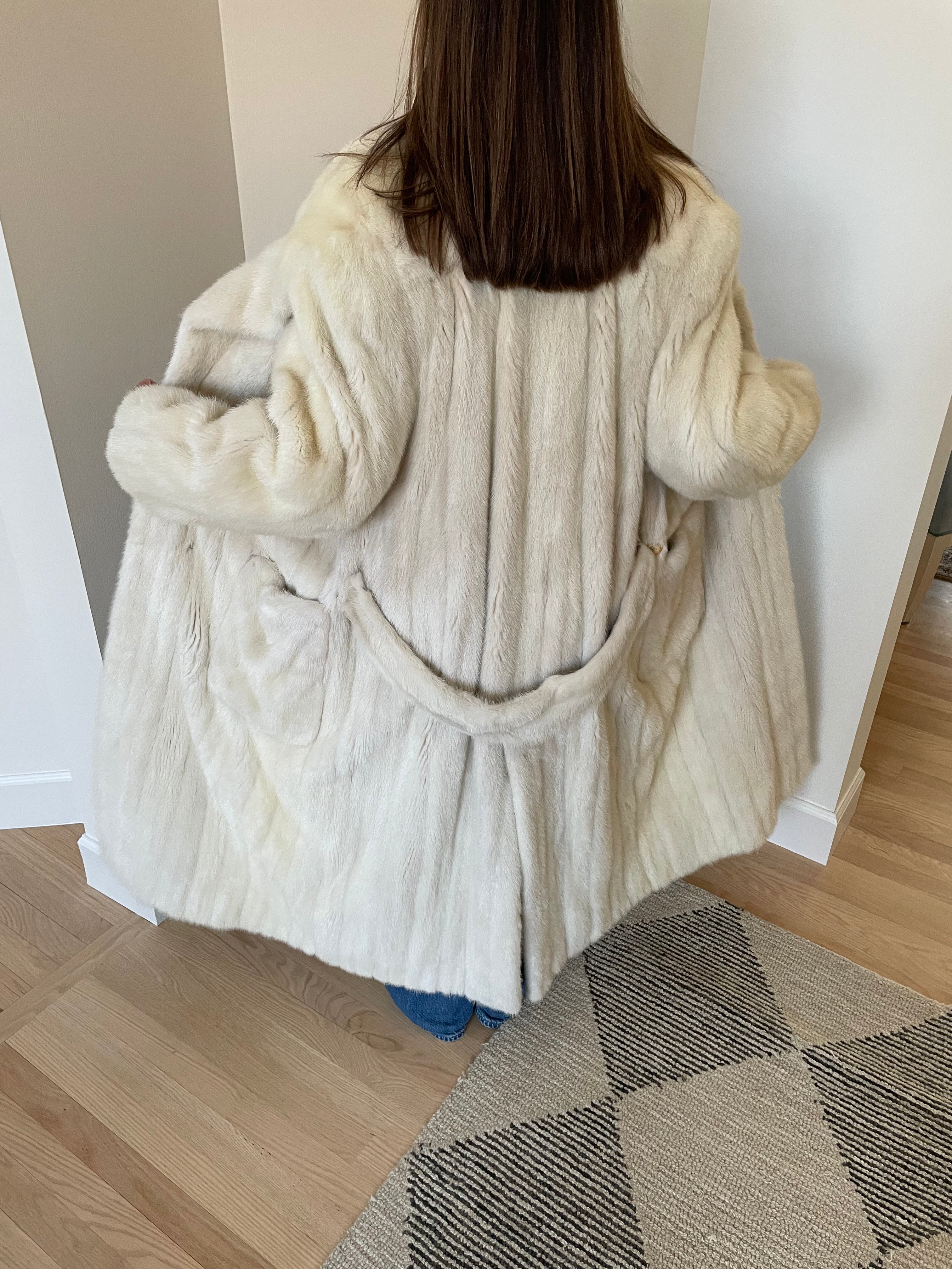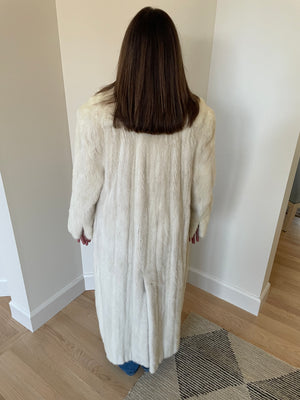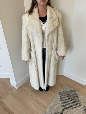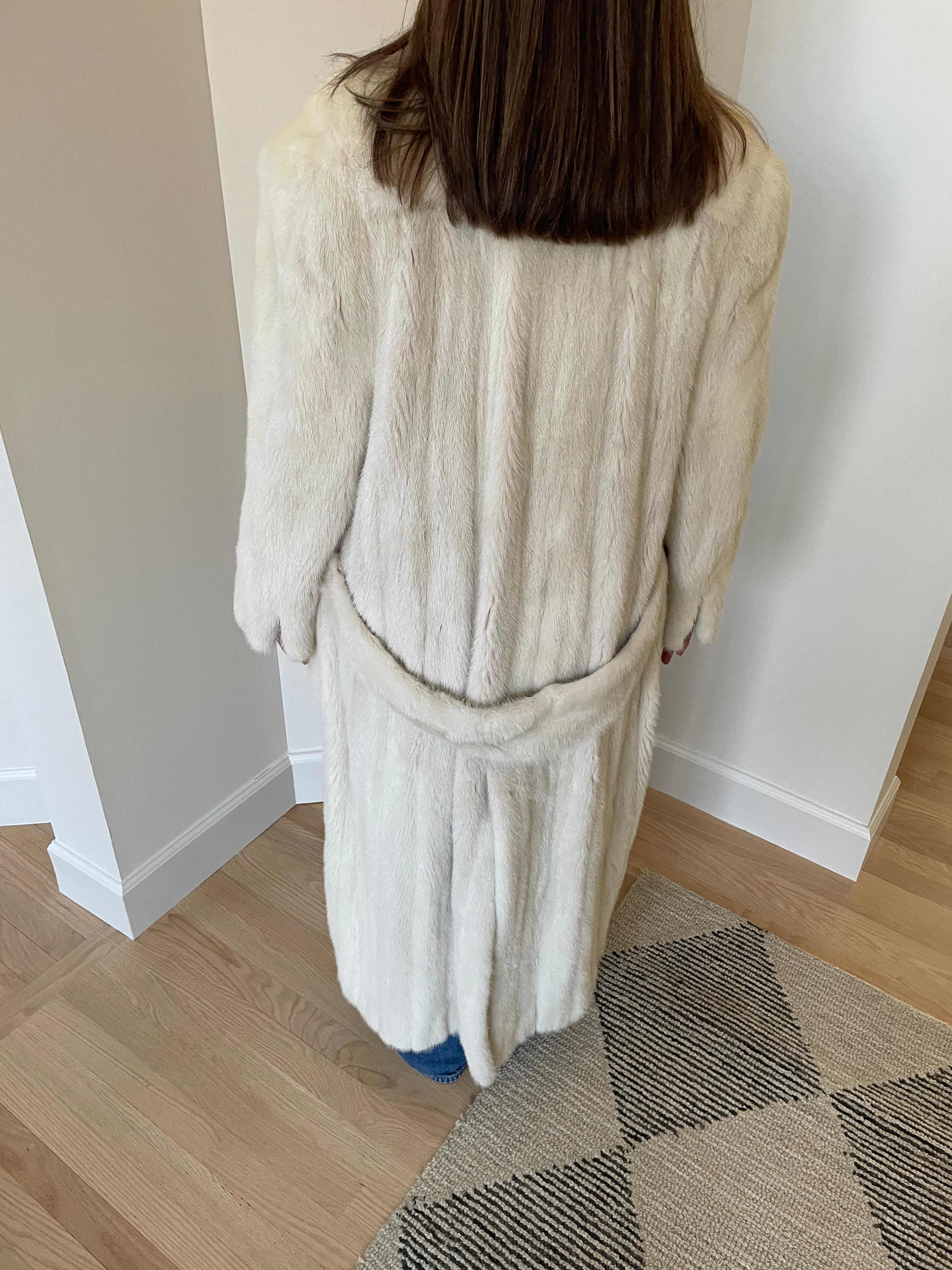 Stunning Ivory Full-Length Mink Coat with Sash and Patch Pockets Size Medium to Large