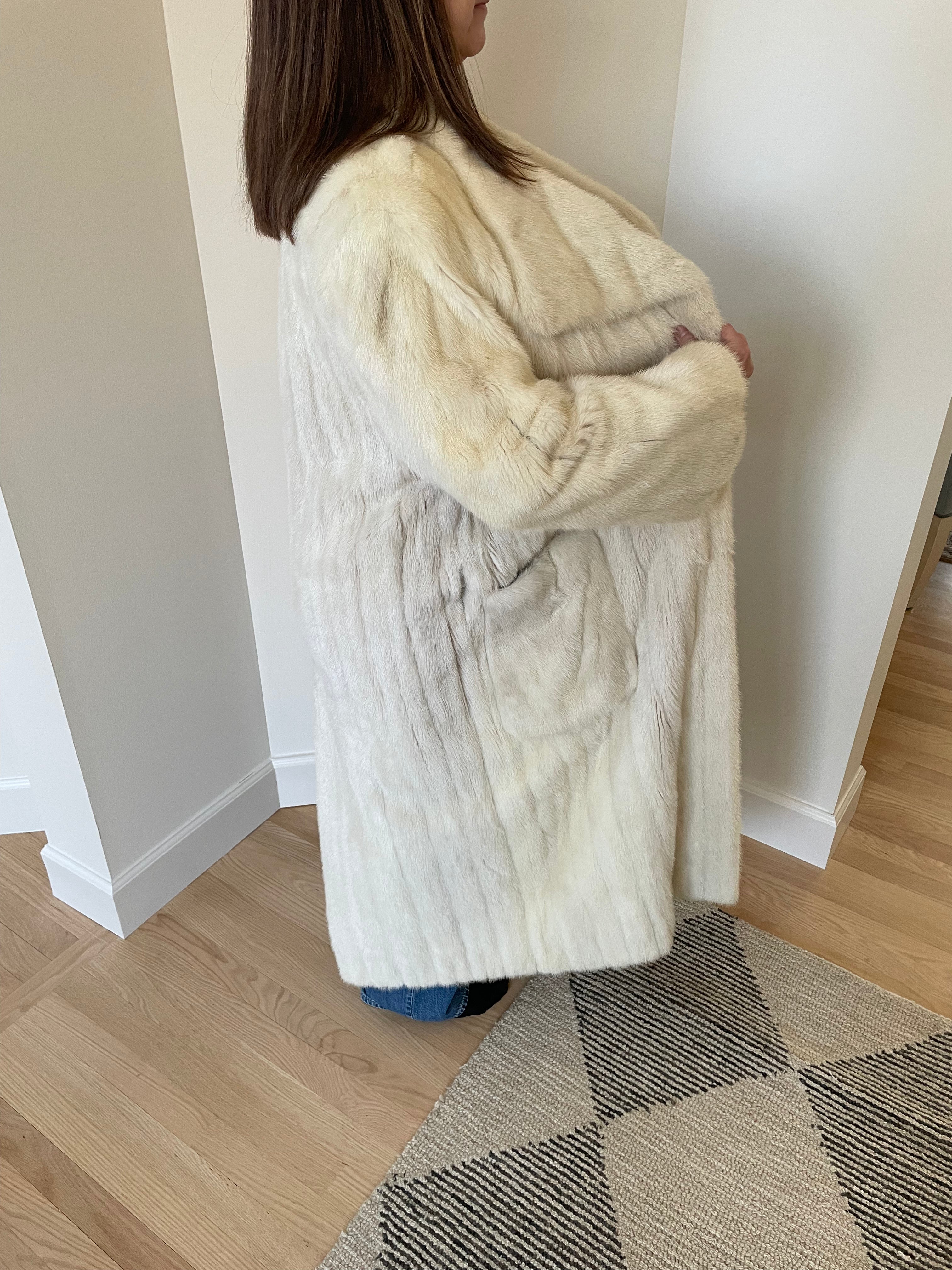 Elegant 50” ivory mink coat featuring a soft shawl collar, flattering vertical let-out design, and matching mink sash for optional shaping. Designed with plush patch pockets for and a seamless silhouette. Plush, supple fur with beautiful movement — a timeless statement piece.