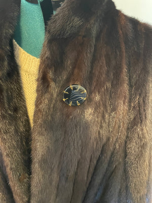 This is a show-stopping vintage dark ranch mink coat, crafted with a full let-out construction and an extraordinarily wide 100-inch sweep that creates breathtaking movement and presence. The rich, deep brown ranch mink pelts display beautiful natural variation and sheen, giving the coat a luxurious, dimensional look from every angle.