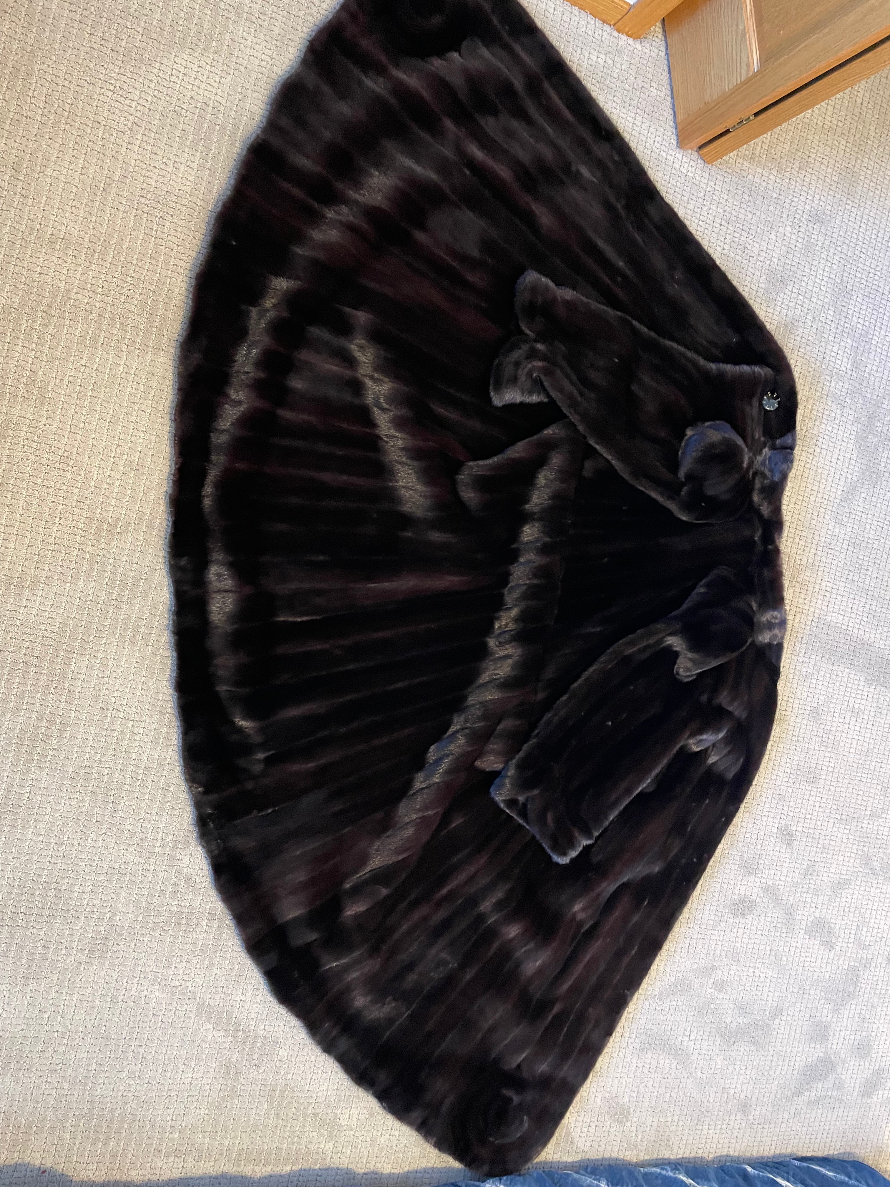 The long, elegant silhouette is balanced by generous sleeves and body, allowing the coat to drape effortlessly while maintaining warmth and structure. A striking decorative accent button at the front adds a subtle statement detail, while the overall design remains timeless and refined. When laid flat, the dramatic fan-like sweep showcases just how much fur went into this exceptional piece.
