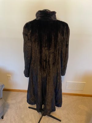 This coat features full let-out construction, creating long, fluid vertical lines that enhance both length and flow. The rich dark brown mink has excellent density and sheen, paired with a sculpted stand/shawl collar and turned cuff sleeves for a refined, high-end finish.