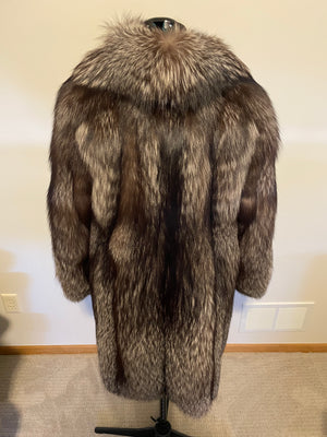 This is a vintage full-length silver fox fur coat, crafted from large, high-quality fox pelts with dramatic natural coloration and volume.